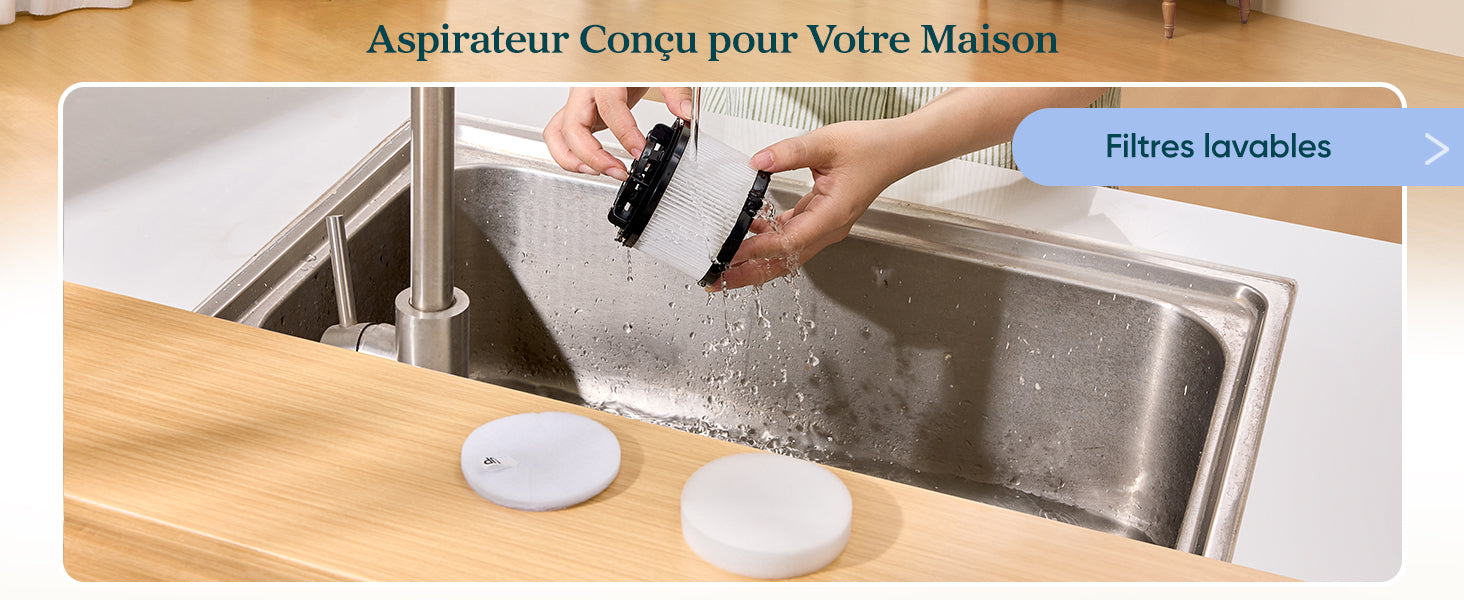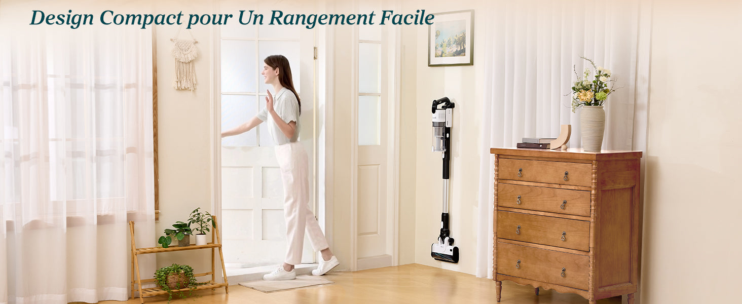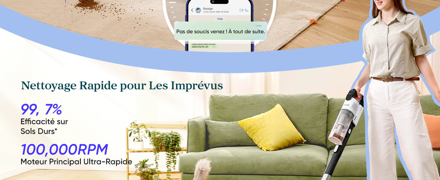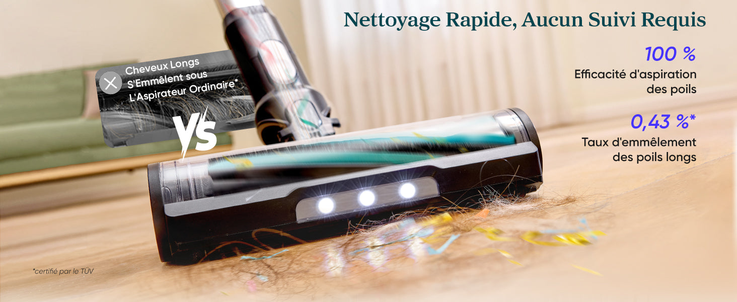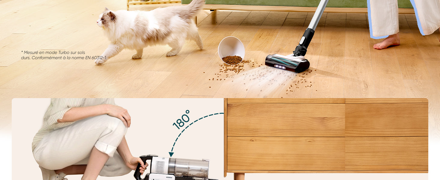 - Puissance d'aspiration durable : Grâce au moteur avec une vitesse de rotation de 100 000 rpm, l'aspirateur balai aspire les cheveux, peluches, poussières dans le récipient en une seule fois, sans obstruer les tuyaux, et maintient une bonne puissance d'aspiration pendant une longue période ; Nettoyer pour sols durs jusqu'à 99%