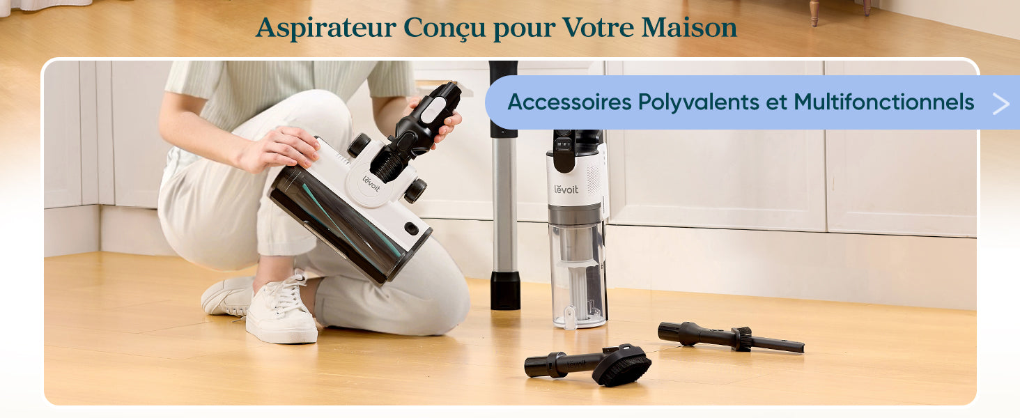 Pratique : Vidage en un clic; bac transparent; accessoires 4‑en‑1 (brosse sol, brosse animaux, fente, tige).