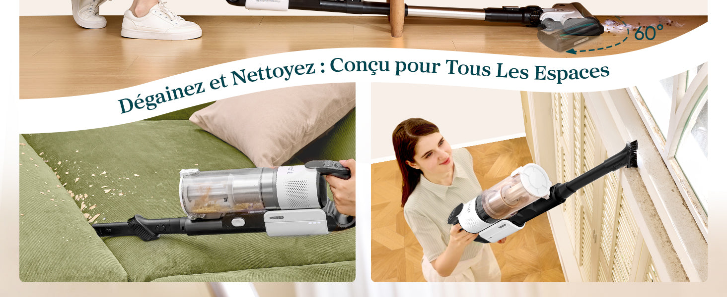 - Facile à utiliser : L'aspirateur total ne pèse que 2,8 kg, léger et facile à contrôler ; Trois lumières LED lumineuses devant la brosse principale peuvent éclairer la poussière et les débris dans les coins sombres ; le corps peut être étendu à près de 180°, permettant à l'aspirateur d'atteindre facilement le fond de la maison et de la cuisine