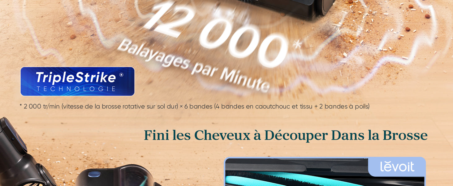 - Élimination de la Poussière à 99,9 % : Moteur sans balais CC de 240 W permet à la brosse brevetée de Levoit (4 lames en silicone et 2 poils) avec 12 000 battements/min d'assurer un nettoyage à 99,9 % sur les sols durs (selon la norme EN 60312-1)