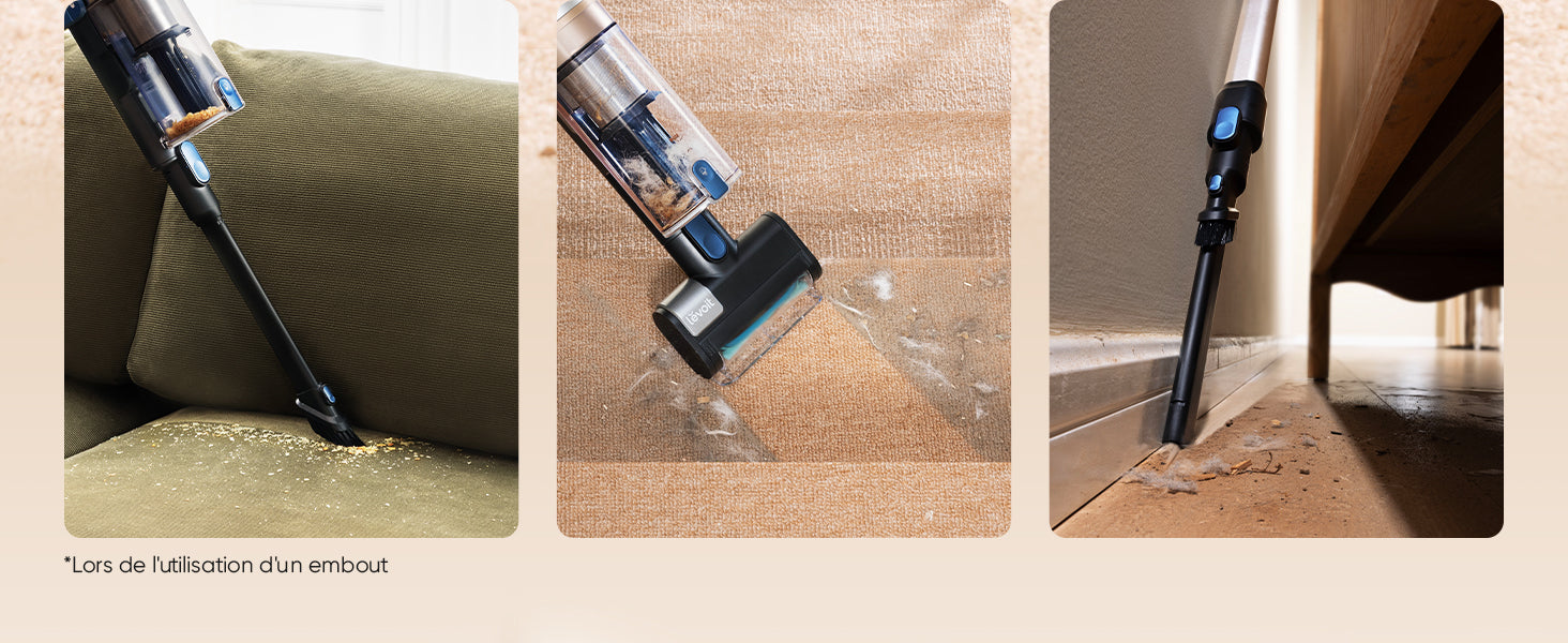 Couverture 360° : Mini brosse turbo pour poils sur canapés & matelas; buse 2‑en‑1 pour zones étroites; brosse principale pour poussière et saleté.