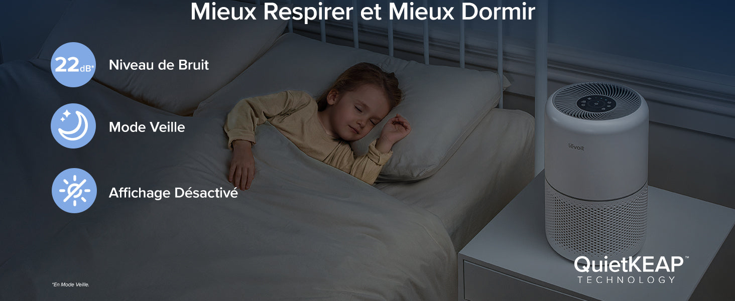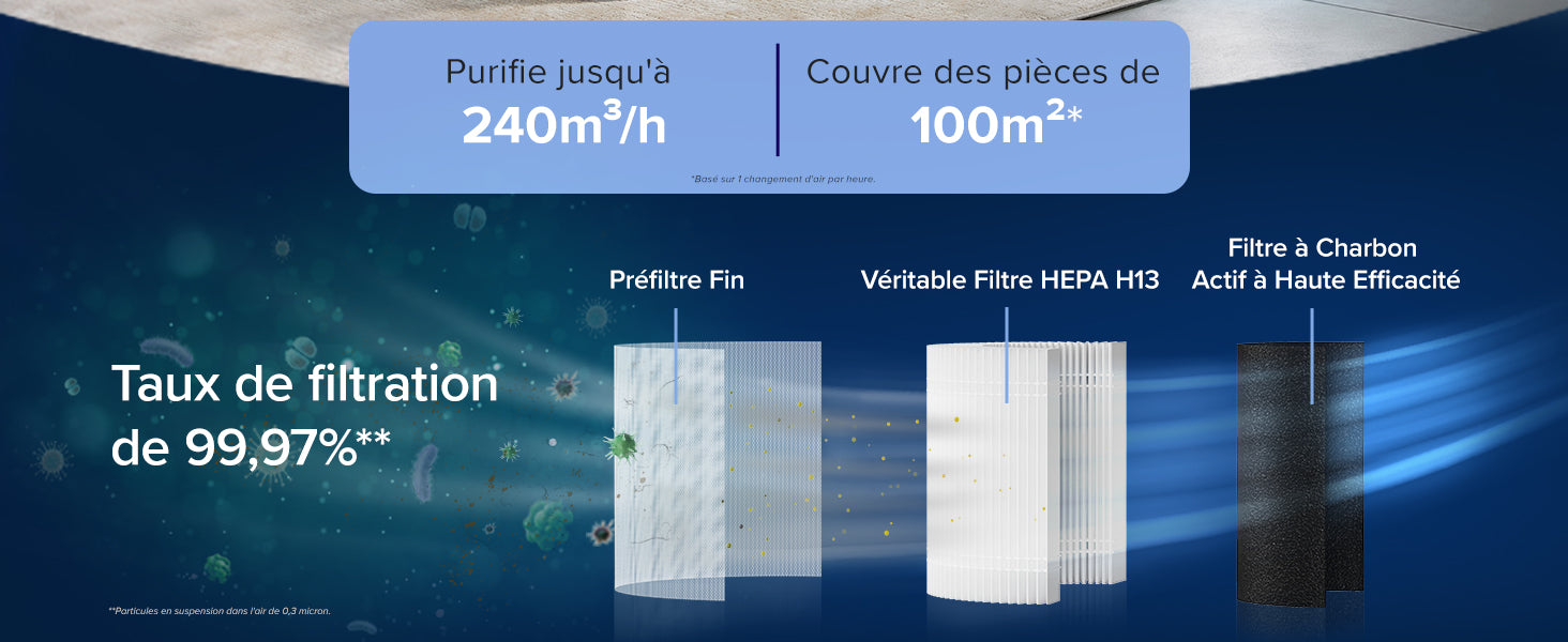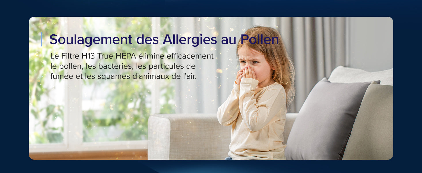 - Filtration HEPA VRAI — capture pollen, PM2.5, fumée et poils d’animaux.