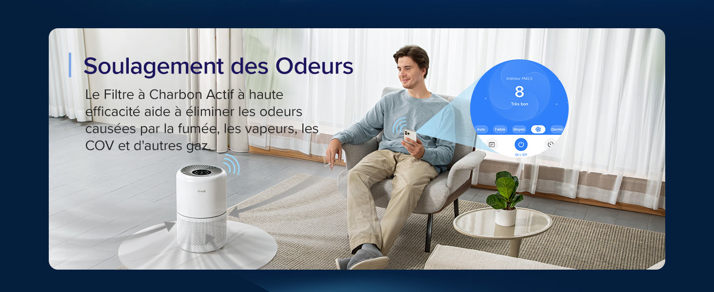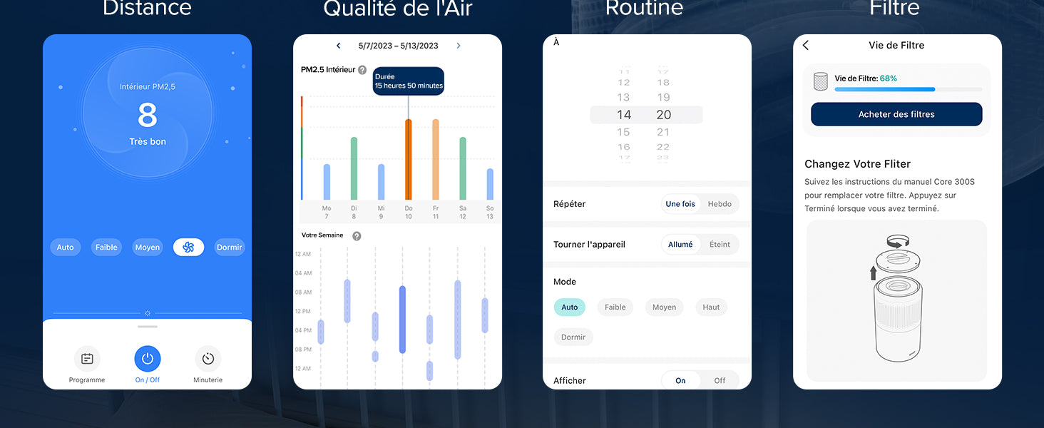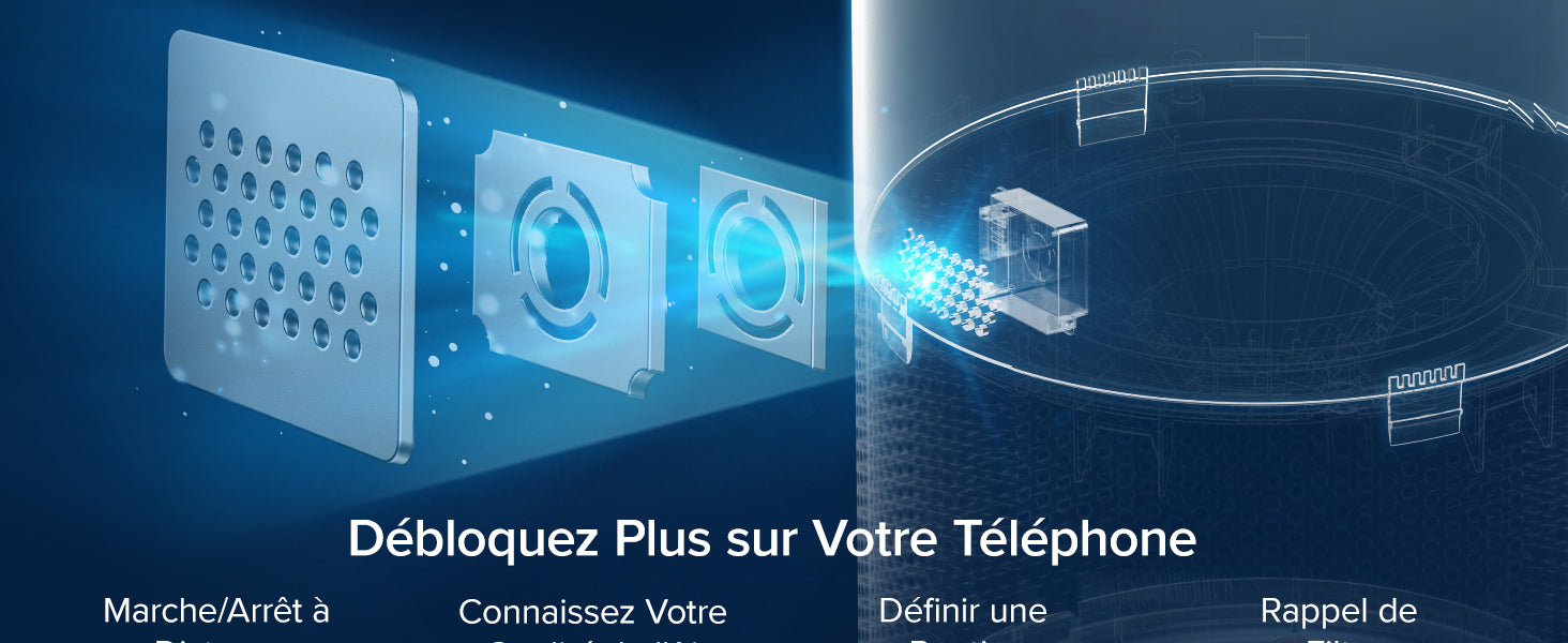 - Contrôlez Votre Appareil à Tout Moment, N'importe où: Utilisez l'application ou demandez à Alexa et à Google Assistant pour vérifier l'indice de qualité de l'air intérieur/extérieur, et la durée de vie du filtre; Vous pouvez aussi le programmer selon vos besoins avec l'application