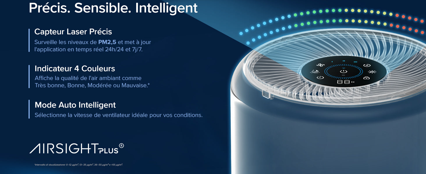 - Capteur AirSight Plus + anneau 4 couleurs — qualité d’air en temps réel, mode Auto intelligent.