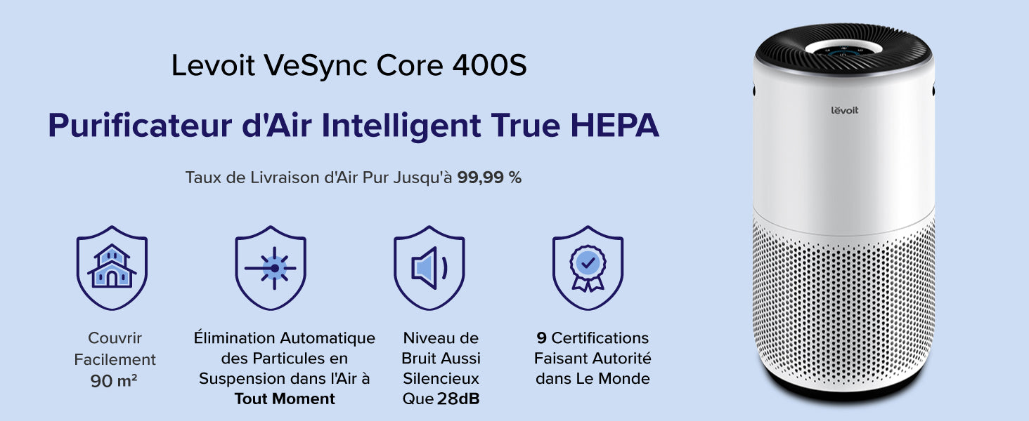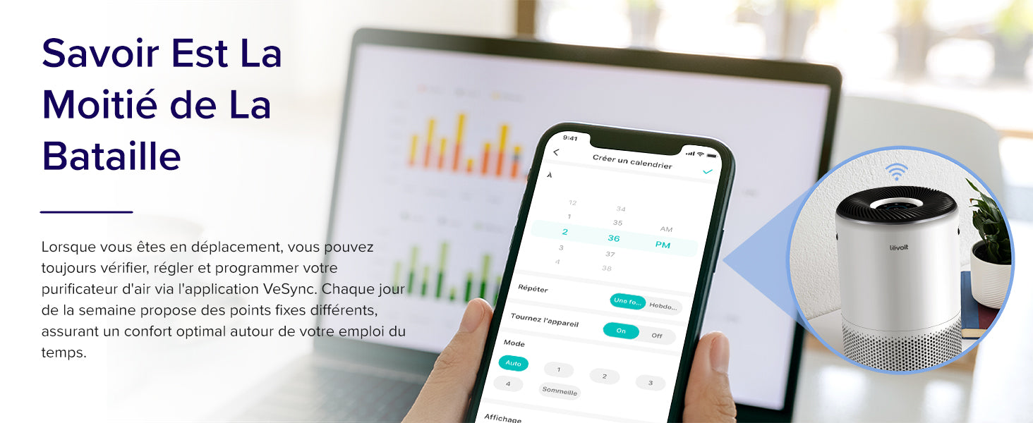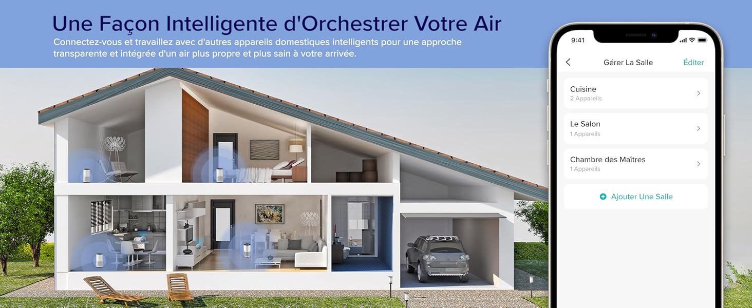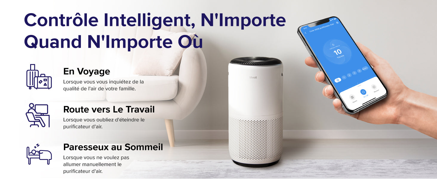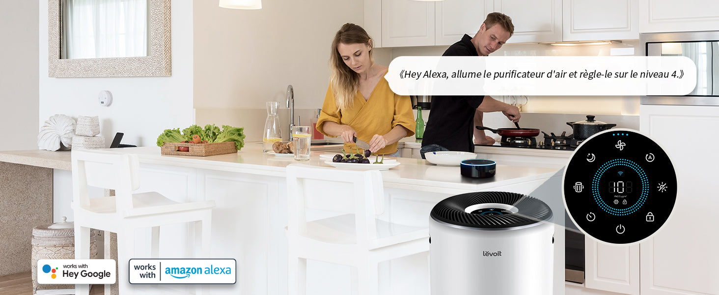 App VeSync + Wi‑Fi 2,4 GHz • Alexa & Google — contrôle à distance, minuterie, suivi filtre