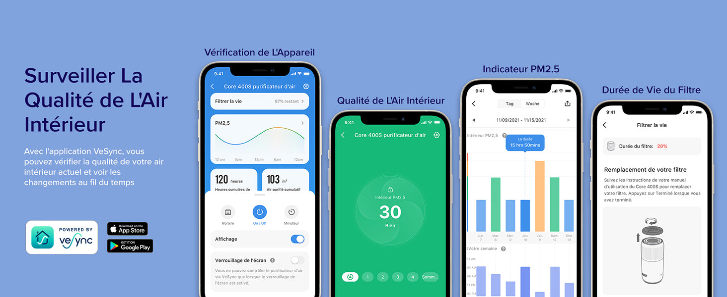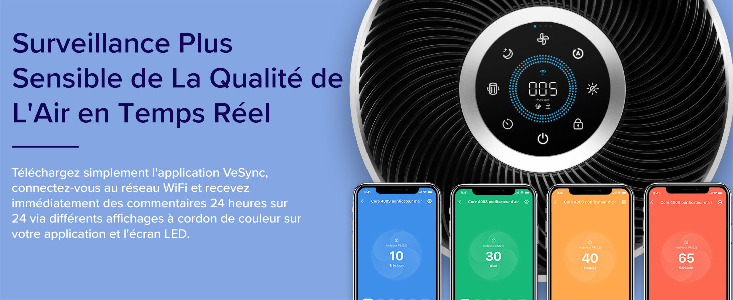 - Application et Commande Vocale: Avec l'Application VeSync, ajuste la vitesse et le mode du ventilateur, vérifie la durée de vie du filtre et l'achete; Utilise WiFi 2,4 GHz pour connecter, utilise Alexa et Google Assistant pour le contrôle vocal, rende votre utilisation plus pratique