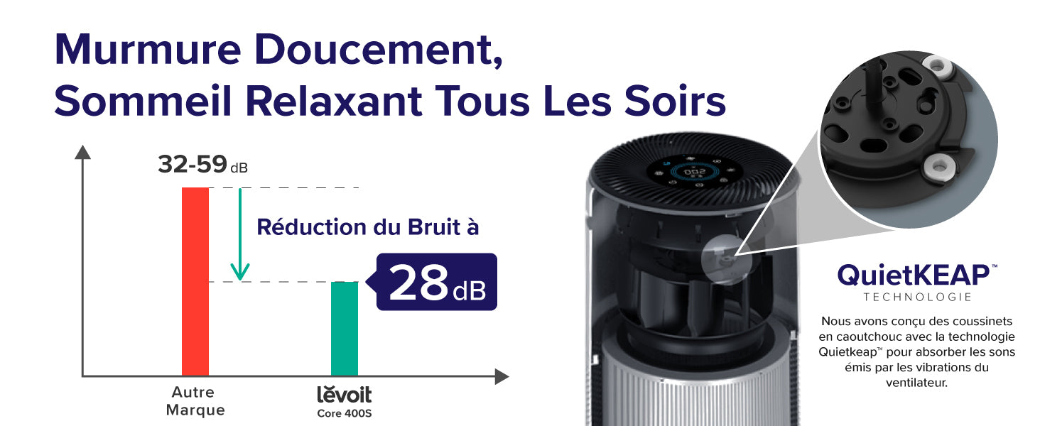 Silencieux 24–48 dB • Mode Veille 24 dB (CADR 100 m³/h) • voyants éteignables