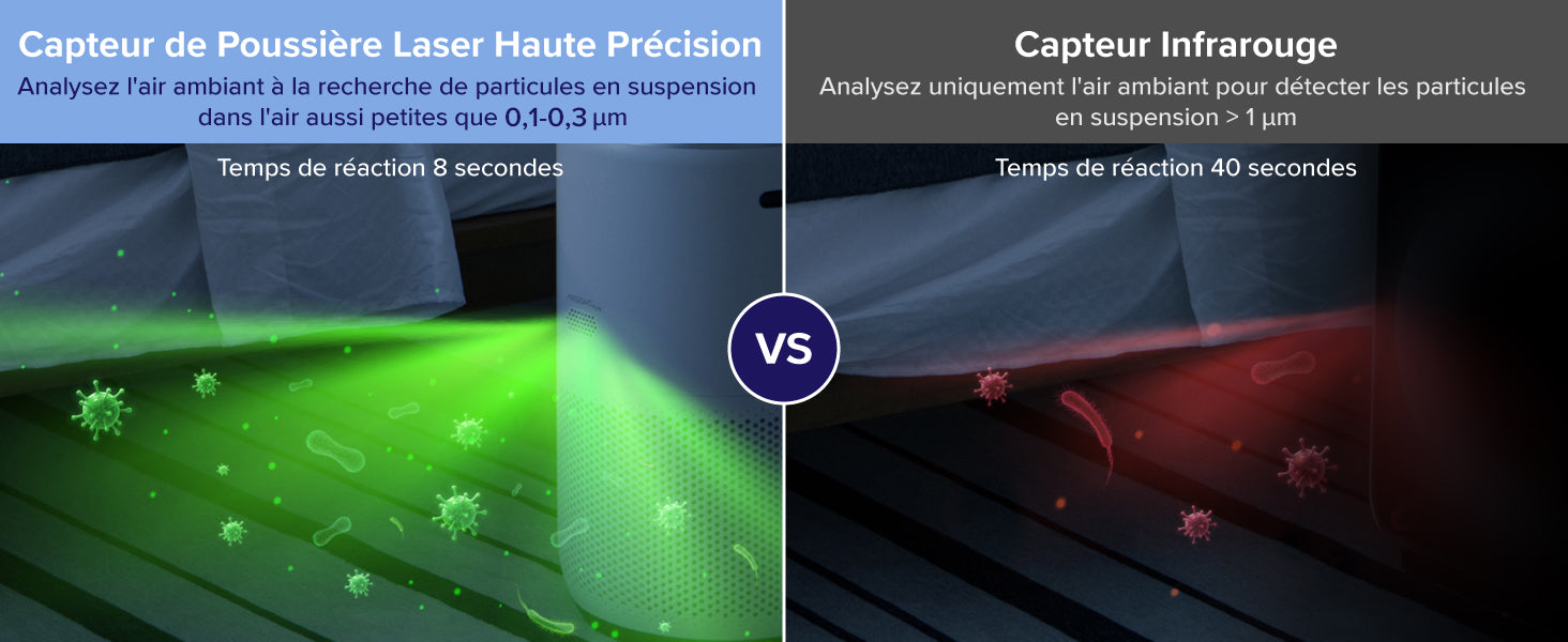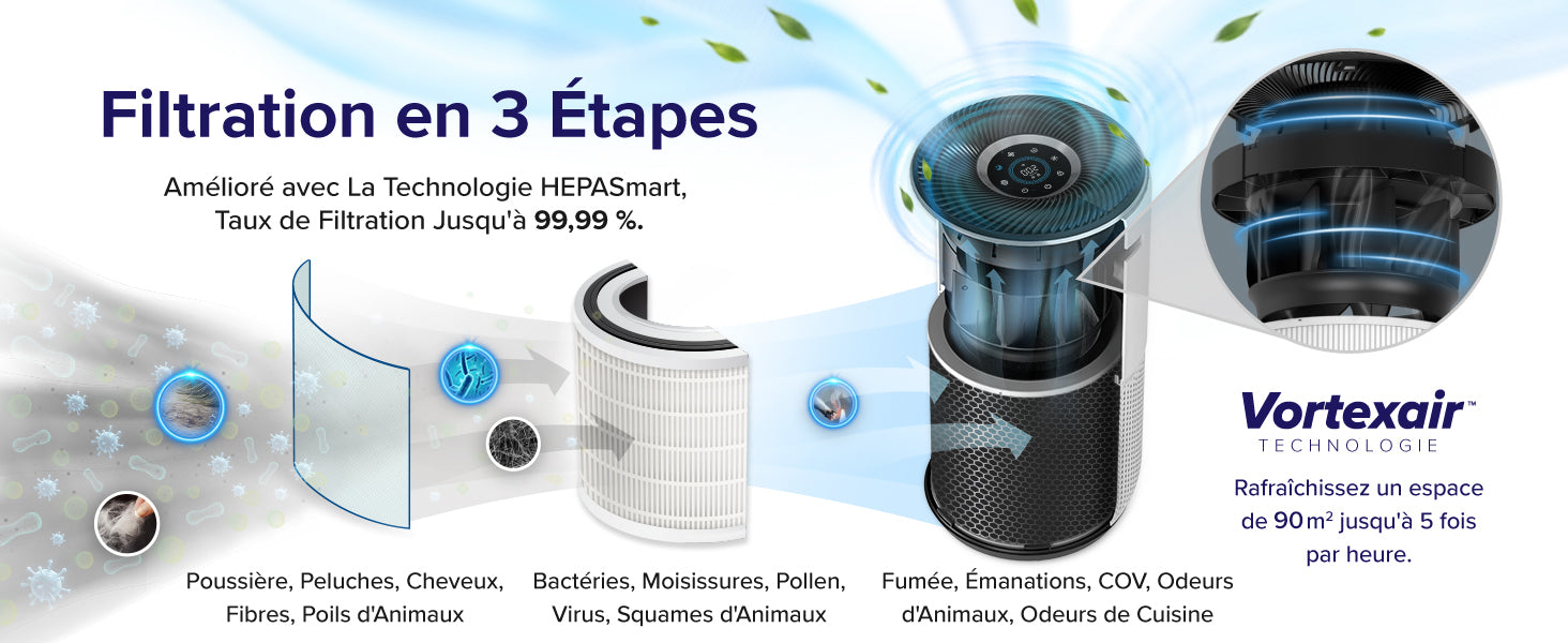 - True HEPA Air Filtre: Filtration en 3 étapes, filtre à charbon actif et élimine 99,97% des particules ultrafines de 0,3 µm, des PM 2,5, du pollen, de la poussière fine et des poils d'animaux, l'odeur, la fumée et d'autres polluants sont protégés