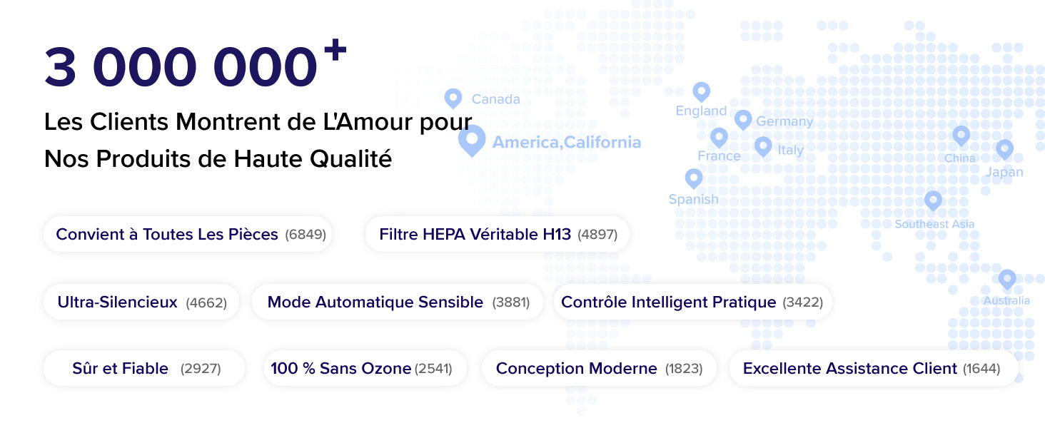 100 % sans ozone • certifications CE/ROHS/ENERGY STAR/CARB/ETL/FCC • filtre à remplacer 6–12 mois