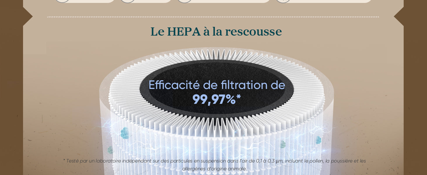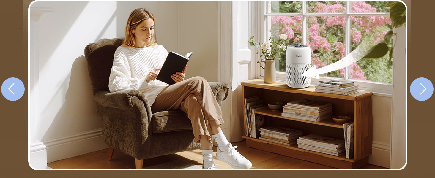 Purification 3‑en‑1 • Pré‑filtre + HEPA + charbon actif — capture pollen, poils d’animaux, PM, fumée et odeurs pour un air intérieur plus sain.